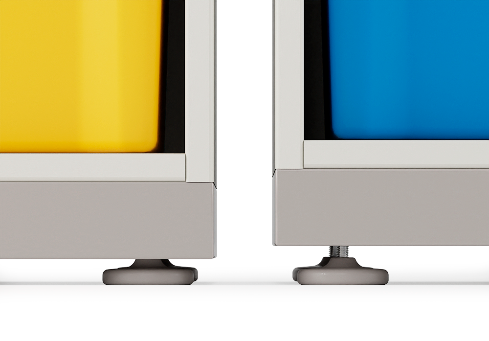 Steel base with adjustable feet for floor unevenness.
